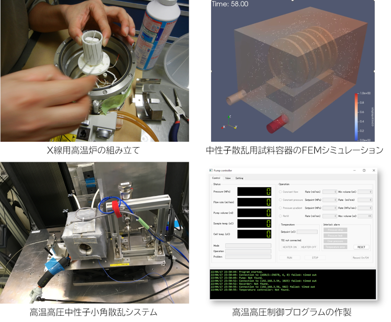 私たちは,高温・高圧・調湿などの特殊環境を作り出す試料環境機器の開発に取り組み,物質の未知の挙動を原子レベルで解明することを目指しています.具体的には,高温高圧中性子散乱セルや中性子調湿環境装置の開発によって超臨界水中での反応プロセスや水素拡散挙動の観察に成功しています.また,中性子と相補的なビームであるX線実験においても同様の特殊環境を整備することでより高度な解析が実現するよう,開発を進めています.